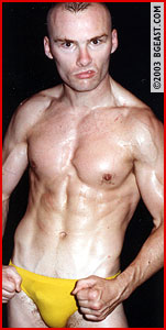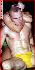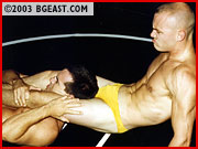 For the new champ's first title defense, he meets our resident skinhead, Kurt Eriksen. Totally cocky, Kurt makes fun of Bass' BG title belt: 'Did you shine that yourself or did you have one of your boys do it for you?' Playful, sexy sparring leads to muscle matching on the mats. Bass sits on Kurt's face, twists his legs, slaps his ass and puts him in a sexy sleeper. All while we get some great crotch close-ups! In the second fall, Bass immediately goes after the injured leg again, but Kurt comes back with headlocks, nelsons, and a very hot neck stretch sitting on Bass' back. Bass resorts to ball grabs and gut punches, but nothing can keep Kurt down. Bass is completely immobilized by a leg split/guillotine move with his crotch wide open. The gloves are off in the next fall as Bass claws Kurt's pecs. The back and forth battle grows increasingly brutal, with the lightweight belt on the line! All leading to an unbelievable submission finish! Great holds, great agro, beautiful muscularity of two of the best lookers, super packed baskets in very skimpy trunks. Classic in every way!