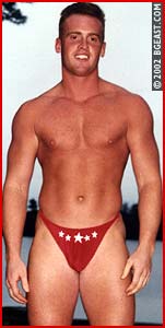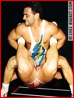 Hunk being the operative word! Redhead Brandon is rulebound by amateur training, so Nick's "illegal" moves catches him offguard. Cocky Nick shows off his ripped physique from singlets to bare chests to g-strings. Finally these spectacular matstuds strip to nothing, grapplin' bareassed with nasty nelsons and headscissors to show who's best. They're excited by the result to have a dual jo contest, but it's the wrestling loser who "cums" out on top.