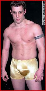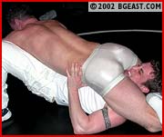 Newbie Kenny warms up dressed in virginal shiny-white perfectly form-fitting squares which cup his magnificent butt. Angelo arrives eager to pop his wrestling cherry, taking him down before he even bothers stripping out of his street clothes. Impressive amateur skills: Angelo works a full-body press/grapevine combo, a waist-locked gut-wrench and a reverse headscissors that jam's Kenny's face into his khaki-clad ass. And that's just he warm-up! Angelo strips and proceeds to initiate the new guy. A brutal back-busting Boston crab makes Kenny instantly submit, but Angelo responds, "already?" and doesn't release the hold until he's good and ready. Both sporting big bulging pouches, the two turned-on hunks trade holds. An incredibly tight and neck-crunching KO figure 4 headscissors finish ends with the winner pulling the loser's face into his surging crotch while he flexes--sublime!