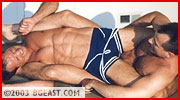 This is a super sexy and sweaty mat battle between two evenly matched and highly competitive grapplers. Right off, Doug drives a hard fist deep into one of Jeff's firm powerful pecs. 'So you wanna play dirty?' Jeff asks, and then tries to give Warren a taste of his own medicine. But the new hunk is simply overwhelmed by Doug's very aggressive assault and wider experience. Doug works over Jeff's impressive pecs repeatedly; Jeff later gives it back in spades. Doug takes the first submission and revels in stripping the singlet off Jordan revealing a well-worn speedo. In the second fall, Jordan shows he's got might behind all that muscle as he gives back to Doug some of the punishment he dished out in fall one. Jordan's speedo is quite transparent from the rear and this makes for some extraordinary viewing especially when Doug clamps on a humping full nelson. Major boston crab action and some spectacular headscissors work. Fantastic!