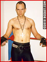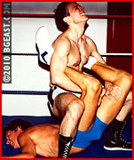 Kid Vicious is happy to accept a Submissions challenge from newcomer Vitas, as lean guys are a favorite of the Vicious one. Getting down to business with knees and surfboards, Vicious relishes face-to-crotch head scissors, and enjoys ball-bashing his prey. Vitas headlocks the overconfident punk but then suffers the consequences: piledriver, headscissors, leg torture and a body stretch submission. Vicious goes berserk, torturing Vitas in the turnbuckle, in the ropes and with a backbreaker, boston crab and leg punishers, one after another, with crotch-to-face pins in between. Here's one rookie definitely biting off more than he can chew! Very Vicious! Submissions galore!