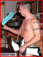 Brad Rochelle's recent descent from college boy hero to heartless heel has made him many new enemies, like Patrick Donovan. And Patrick has a long-simmering grudge against Brad for his humiliation loss to him on WrestleFest 2 in front of a jeering audience of other BG wrestlers! Patrick arrives at The BG East Arena for a long-planned and much anticipated private match with his long-distance buddy Steven only to find him bound in the ropes and being abused by the hated Brad. Outraged, Patrick charges in and saves Steve from Brad's punishment by slamming a swift tight claw hold right onto Brad's balls, sending the heel screaming to his knees! He frees Steven from his rope bondage and invites him to join in the Brad-bashing. Steven happily accepts! They toss a ball-clutching Brad into the ring and a double-teaming of unprecedented abuse soon has Brad screaming in submission. It begins with each man grabbing one of Brad's legs for a brutal back-bending boston crab, replete with a humiliating spanking. Next, Patrick grabs a leg and arm and ab-streches Brad out open wide so Steven can take sweet revenge on Rochelle's vulnerable mid-section. The reprimand continues in the corner, where Brad is further set up for additional ab punching, leaving Brad pleading for mercy. When Jonny enters The Arena to return to the errant boots, twirling Shannon's baby blue speedo around his finger, he's quite shocked and even amused by this unexpected turn of events. Jonny stands back to admire the Patrick/Thomas tag-team's handiwork. When Brad finally realizes jonny is at ringside, he both orders and begs Mr. Firestorm to free him from this Hell. Jonny takes his sweet time in responding until Brad makes some very unambiguous threats. After watching the babyfaces-turned-goons left Brad bounce him down over both their waiting knees, the disgruntled "gardener-janitor" finally enters the ring. At first it seems unclear which course of action Jonny will take. He pauses to observe and admire the chest and gut bashing the two heretofore babyfaces are slamming into Big Bad Boss Brad. Is it possible that Jonny will make it a 3 on 1? Well, not if Brad has any powers of persuasion left in his battered body! Duly warned Jonny finally and reluctantly chooses side and saves his bullying boss adversary. Patrick and Steven are clothelined down and summarily double-DDT'ed onto their pates. With the babyfaces knocked off their power perches and nearly knocked out, Brad recovers enough to join in the double-teaming. Patrick and Steven get scoop-slammed and schoolboyed by the now-united and burgeoning BG tough guys. After busting the pretty boys' guts and bending them into pretzels, the team of egos finally puts Patrick and Steven out of their miseries with matching and very lethal figure-four headscissors. Does this signal an alliance between Brad and Jonny? Should Kid Leopard be concerned? A phone call to KL: "Boss, you wouldn't believe what's been going on around here!"
