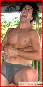 Maybe it was the punches or the ball grabs? Even when TJ thinks he has Jonah immobilized, Jonah manages to get in a blow that sends the older man staggering. And as their clothes come off, Jonah even uses those as weapons! Soon, they are down to their underwear, Jonah wearing tight see through squares that hug his pretty young ass like a second skin, TJ wearing a gun metal squares that emphasizes his 'Canadian bacon' but despite all this evidence to the contrary TJ still seems to think he is wrestling his young friend, rather than an aggressive, even vicious young cub!