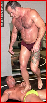 Like the seasoned mat men they are, the two studs shake hands and the match is on! What follows is an impressive display of mat wrestling. The two muscled studs go back and forth, trying to find a weakness to exploit, neither able to get a clear initial advantage over the other. Brook's superior strength is obvious - powering his way out of any slight gain Tony might make and steering clear of any potential submission predicament. And all of Tony's skills are necessary to keep him out of the clutches of brutal submission holds the bigger man is itching to clamp on! Brook's game plan is obvious: wear the smaller man down! And when Tony makes a slight miscalculation, the big man pounces to secure a quick and decisive advantage! Soon Tony is tied up tight and screaming out his submission! Brook takes a moment to contemptuously pose on top of his defeated opponent, his strategy bearing the results he'd planned.