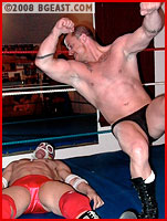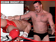 Not on your life! Joe powers his way out, and goes back to work on that battered midsection, even offering the masked one a free shot of his own at the Mazetti midsection! The two trade blows, but Joe just toys with Mask, even choking the stud out! But that's not enough for Joe, waking him up to treat him to more punishment! Finding some foreign objects in the ring area only awakens his sadistic creativity. Will MuscleMask be able to survive this match to wrestle another day? Or will Mighty Joe M put an end to his wrestling career before it really has gotten started?