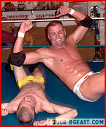 As soon as Jobe gets to the ring and gets a glimpse of Billy, who politely holds the ring ropes open for him, he sees red. He storms over to the phone and calls the The Boss' office. "Are you fucking kidding me? This kid is just SKIN AND BONES!" he screams into the telephone before slamming the receiver down in a rage. He climbs through the ropes, his face reddened with his righteous anger, and determined to teach this 'skinny kid' a bit of a lesson, courtesy of the centerpiece! He starts out by dragging Billy around the ring in a headlock - and introduces Billy's face over and over again to the "famous BG East centerpiece!" As he tosses the youngster around, it's beginning to look like Jobe might finally WIN a match in the Arena.