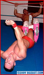 A big bodyblow turns the tide, and it's Scott's turn to work the arm. Rolling hammerlocks, standing deathlocks and leg drops until Exavier rolls to the floor. But when he stumbles too close to the ropes, Scott pays him back for the earlier rope work. "I'm gonna kill you," Exavier insists, but his follow-up, "You're breaking my arm," is a decided qualifier. A submission each, and the match takes another turn. We're big fans of uber-intense badasses, but Exavier's tortured sputtering and spitting as Scott stands on his throat and chest makes us wonder if there's such a thing as too much aggression. This is gonna get NASTY!