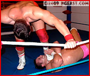 Chokes and half-sleepers, Exavier nearly goes out. He escapes with repeated elbows to the gut and a huge boot between Scott's beefy thighs from behind is a momentum reverser. From arms to legs, all appendages are attacked--kicks, snaps and sweeps. Scott escapes two near pins in a row. But when Exavier grabs a leg and catches a reverse enziguri kick to the chin, it's anybody's game again. Face-ripping and choking with wrist tape, but the recipient retaliates with a big low blow and a bigger DDT! Both wrestlers are now dirty to the core, and neither wants to lose. Figure 4s and another breath-taking tape choke is a near knockout. But near isn't nearly good enough, and this is where one wrestler makes his bones while the other just gets boned. Crippler crossfaces and death valley drivers! The sort of wrestling that other feds can't provide is our standard operating procedure. The quintessence of BG East.