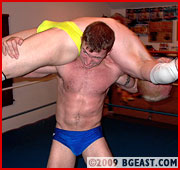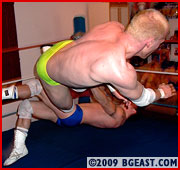 Greg arrives at ringside wearing a sparkling gold ring vest and climbs to the apron. Jonny is greatly amused: â??What are you supposed to be?â? Jonny sneers at his lean blond rival. The bell rings and Greg launches into some impressively quick movesâ??a smart snapping armdrag takedown that earns a â??not badâ?? from Jonnyâ??before he just as adeptly brings the blond down with a knee-busting, tendon-testing, drop toe-hold. â??Wanna give up?â? Jonny asks. â??I donâ??t want to have to hurt you.â? Greg just laughs it off, smartly escapes it and the two get up, circle around again, trying to take the otherâ??s measure.