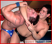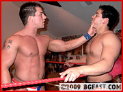 "Now thatâ??s what a real man looks like," states Braden, flexing his biceps in the mirror, a boot atop his fallen foe. Pedro makes the mistake of calling Braden an asshole which elicits several kicks to the mid section and a bow & arrow that makes the newbie cry out, "I give!" yet again! Still not having learned his lesson, Pedro is schooled again, his face repeatedly slammed into the turnbuckle followed by a backbreaking rack across the broad shoulders of Braden Charron. Maybe Charron has finally earned his keep at BG East? He's certainly proven himself in this match! Breaking in rookies and putting them in their place could be Charron's new-found specialty, judging from this spectacular submission show!