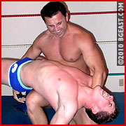 What's hard to read here is what's going on in J-Rock's head. The man has never been a big one for letting his feelings show. Part of the menace he projects has always been the dispassionate manner in which he dispenses with an opponent. Right now his body is racked in pain. His grunts and groans fill the room. It's rare to see J-Rock in such a vulnerable position. He suffers beautifully, it must be said. But then something seems to flicker over the expression on his face, something cool and and calculating. It's almost as if he can channel the pain into rage and the rage into payback. And if he does regain the dominant position in this match, just what kind of hell breaks loose then? Two big bouncing bruisers in the spectacular main event finale to a very sexy Big 'n Beefy 6!