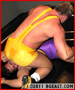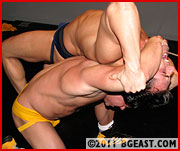 Sweat & muscle, almost as good of a combo as crotch & face. Kieran poses over a pinned Jimmy Gee