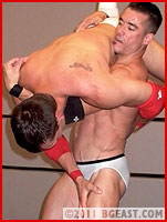 Cole's overpowering physical superiority, raw strength, superhuman conditioning, and masterful execution of wrestling domination, particularly brutal head-banging finishers, is nearly perfect. But nearly perfect is often the equivalent of being fatally flawed in the high stakes world of BG East wrestling! Locking on a figure-4 leg lock and threatening to permanently cripple Brendan, Cole underestimates the leverage those long limbs of Brendan's can generate. The lanky stud succeeds in flipping Cole over and reversing the pressure, now placing Cole's knee in danger of serious damage. The ripped veteran finds himself in completely unfamiliar territory, with an angry babyface opponent in charge.