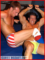 Coop opens Fall 2, diving off the middle rope onto Z-Man, who is still shaking the cobwebs out of his head after the rigors of the first fall. After a sound re-thrashing of Z'man's stomach, Austin moves up the torso to squeeze and knead Z-Man's symmetrical pecs. But the tables turn when the tormented victim slugs his tormenter square in the jaw and locks him in a headscissors. Then, he hoists Austin up on his back in a brutal hangman hold, in which awkward and painful position a submissive Cooper must strike a bicep pose of his own before Z-Man will release him. This could be a serious game - and match - changer!