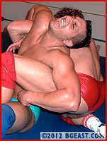 A third attempt at a show of good faith results in simultaneous clotheslines that drop both to the mat. It's like both BG bad boys are thinking with the same brain! Mac gets to his feet first and presses the advantage by quickly tossing his stunned opponent through the ropes to deliver a brutal assault outside the ring. He rams Exavier's face into the ring post. "Where's that ego of yours!?" Mac taunts him when he's down. Just when Exavier says he's ready to let Mac have the mirror all to himself, he lands a beautiful kick to the curly-haired hunk's kisser that turns the tables. With single-minded focus on injuring big Mac for good, Exavier assaults his left knee with everything he's got (including the ring ropes).