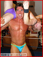 There are not many who can step into the ring with a man one hundred pounds heavier and still make fans believe they're watching an even contest. But that's Paul Hudson for you. Smaller and lighter than most of his opponents over the years, Paul has learned to tie men in knots and fuck them up. Pushed too far, he changes, in a fraction of a second, from the boy next door to a snarling beast. He has mastered the art, if it can be called "art," of losing every civilized inhibition and releasing and even amplifying the savage brute within. The moment comes in this match when Joe Robbins, out of arrogance or sadism, pushes Paul to the breaking point. Paul explodes. Joe climbs the top rope to bombard Paul from the air. Paul rolls clear, and Joe's head hits the ring post. Joe objects, "Nobody makes a fool of me like that!" Paul sneaks in from behind and smashes Joe's nuts: "We'll see about that!" he hisses, in disgust, as Joe grovels and groans in pain.