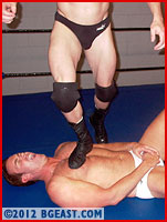 More than once Drew Russell protests, woefully, "It's not fair." Well, life's not fair, big guy, and if you're looking for even a modicum of fairness out of life, the one place you never want to find yourself is in the squared circle at BG East, especially not against the likes of Cole Cassidy. Cassidy has his own brand of justice, and it has nothing to do with fighting fair. Cassidy is especially lethal once he corners his man, lurching in to deliver lightning jabs to the chest and stomach, then rearing back to plant the sole of his boot against the sternum. Blows fall on Drew like the pop-pop-pop of summer firecrackers. And then there's Cassidy's favorite perch of all: with his victim cornered, Cole balances on the middle ropes above him, his bulge hovering over - or unceremoniously mashed into - his opponent's face, as he rains down a flurry of fists and fury with a huge side-helping of humiliation.