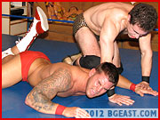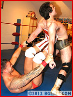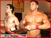 Morgan's modus operandi is to stroke his opponent's ego at the start. He distracts Chace with praise, admiring the tanned hunk's "big guns." When Chace is mesmerized by the sight of his own flexing physique staring back at him in the mirror, Morgan drops to one knee behind him to deliver his signature uppercut to his opponent's balls! Appearances can be deceiving, however, and Chace blocks the low blow, quickly tying Morgan up and shoving his huge bicep in Morgan's face. Like we said, this is a brand new Chace, and this one is bigger, badder, and tired of getting battered by BG badboys. He capitalizes on his size advantage to rip the Mastodon apart, limb-by-limb. Chace is smooth, transitioning from one comprising hold to the next with surprising efficiency and grace. Like Morgan, you've got to be asking yourself who has been coaching Chace LaChance! Morgan's hunky, hairy body is stretched out and pried apart in a stunning display of mastery and control. Chace's body isn't the only thing that's changed since last we saw him!