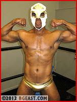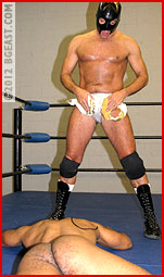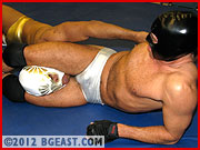 Is this Gold Mantis' worst nightmare or undreamt of fantasy!? Cage Thunder flexes over top of him, shoving his packed pouch into the rookie's gasping mouth! The rookie's groans could be approaching ecstasy or crippling agony (or both! --could Mantis secretly desire the ultimate beating Cage might deliver?). When Cage Thunder leans back and closes his eyes, squeezing Gold Mantis in a crotch-to-face headscissors, there's no doubt about what the veteran is feeling, however. Mastering another hardbodied, golden rookie makes Cage Thunder swell with excitement.