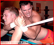 Sexy Scott wrings a first fall submission out of Shannon and immediately ignores it in order to enjoy watching the "kid" suffer. The gratuitous punishment quickly earns him a barrage of revenge attacks that leave the sexy Southerner 'begging' on his knees for Shannon to "spare the face!" Shannon isn't too keen to spare anything at the moment, setting his sights on ripping Scott's arms out at the shoulders and leaving sexy Scott's bubble butt and overinflated ego crushed in the center of the ring. Scott is determined to make sure he teaches the upstart a lesson.