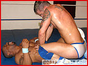 Things don't go as easily as Trent hoped. After a violent start, the arc of the fight shifts. Darius is strong and crafty enough to turn the tide, and he brings Fall 1 to a close with a brutal Boston-crab submission. Bristling with resentment, Trent determines to go for broke in the 2nd fall. He uses his height to good advantage, trapping Darius in the corner for a vigorous beatdown. Already the strapping young wrestler is breaking into a slick glimmering sweat. His chest, stomach, and biceps catch the light, as his teeth flash from the side of his mouth, a crooked smile, half a strained smirk from wrangling Darius's muscle, half a leer as he makes his opponent moan in pain. One count away from a pinning three count, Trent decides he would rather go for a backbreaking submission and yanks his opponent's shoulders up off the canvas. It's a hasty and irresponsible decision, and it might have backfired, costing him a second fall, but Trent gets his submission with a torturous backbreaker that leaves Darius crumpled, forehead down on the mat.