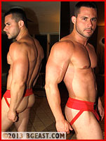Red hot jockstrap showcases hunk extraordinaire Marco Carlow's perfect glutes, huge arms and pecs