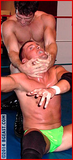 Jobe waves his arm around frantically, searching for a escape route from Dick's dastardly chinlock