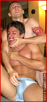 Z-Man follows his victory with a tight, punishing bearhug. Eli's lean 26 inch waist makes for a tempting target for any bearhug practitioner and Z-Man has the power and technique to make it count. Eli struggles and suffers in Z's muscular grip and looks to be gasping his final breath as he melts in his opponent's killer grip. But suddenly, like a viper, Eli strikes back with a string of kicks and punches designed to weaken the muscle man and take him down hard. It's quite possible that Eli meant for Z-Man to react earlier exactly as he did, perhaps even seeing an initial loss of a submission fall as an acceptable risk to take, if for no other reason but to feel out his opponent and learn what he is capable of.
