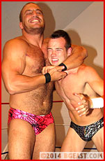 Submissions fly left and right, but big Guido quickly grows tone deaf to them. A Boston crab twists Kirk's back at a sickening angle, making the rookie scream, "I give!" But Guido just keeps cranking. A rear naked choke crushes the newbie's windpipe beneath Daddy's thick, bulging bicep, leaving just enough room for Kirk to rasp repeated pleas of mercy. Guido ignores them all. "This is what I do! This is why I love my life! I just choke little mother fuckers out!" He hoists the kid up and down, dragging Kirk's drenched body across every inch of the ring in complete domination. A standing full nelson shows off the beautiful rookie's hot, lean body. From that full nelson into a head-over-heels suplex, Guido knocks the kid out cold.