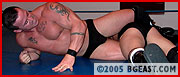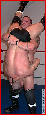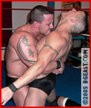 ...A huge, leaping elbow drop allows an easy pin but Cole's tank is far from empty. Cole capitalizes with a bow 'n arrow that makes rarely-on-the-receiving-end Joe gasp, "Oh shit!" One round apiece, and Cole throws in a sneering mindfuck along with heavy boots to the ribs. Joe stumbles into a bodyslam. Cole shows his power, lifting the undefeated heavyweight monster heel in an inverted bearhug as prelude to a tombstone, Cole can practically taste victory. But just because Joe's never had to resort to one, that doesn't mean he isn't full of surprises... The match could go either way, and on another day, it might have. But victory is total--a methodical pin courtesy of a high-impact finishing move. The winner mugs for the camera: "You had your chance, but couldn't finish the job!" and taunts, "In the end, look who's on his back, and look who walks away!" But with guys like this and an unreffed ring like ours, "victory" doesn't always mean "the end." As blatant and as huge a low blow as we've ever seen has one writhing, twitching and moaning, ripe for a most unsporting final attack. "Just so you remember me for a long, long time." And as the sore winner seethes, mayhem flashing across his face, he will, he will...
