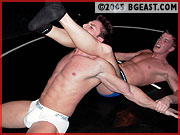 "There's only room for one superstar" says Josh as he struts around the matroom in victory. Cameron goes on the offensive but instead gets caught with some Junkyard Dog style headbutts. Cam surprises Josh with a strike to the face and then strips the veteran down to his white briefs! Cameron gives Josh a taste of his own medicine by choking him with his jeans, leaving him gagging in pain. Back on his feet, Josh adjusts the waistband of his briefs and even reaches in to adjust his package! Damn! Josh checks himself out in the mirror, only to get caught from behind by a vice-like headscissors and forced to submit! As Josh recovers, we're treated to incredible closeup of Josh's package, so close and so big you can almost taste it. Action resumes and Josh is choked with his own sock, surfboarded, wedgied and forced to submit again! Cameron goes for another wedgie but is lowblowed and given a spinning neckbreaker. Josh traps Cam in a bearhug/wedgie combo, slamming the rookie into the wall at the same time! Josh rolls Cameron up into a hot schoolboy and plants his crotch in the kid's face for the pin! A post match sleeper finishes off our humiliated hero and another stunning edition from BG East!