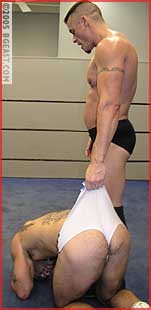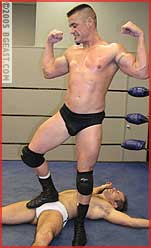 Derek savors his victory with a schoolboy pin, his big basket looming over Cole?s face. But when you play too close to the fire you run the risk of being burned. A headbutt to that bursting bulge is just the start of an all-out ball-busting assault. Cole clamps on to that sack with a crushing claw hold. He lifts and spreads Derek?s legs and grinds his boot on those pristine white trunks. The recently triumphant challenger finds himself whimpering in agony on the mat. Cole wedges the stud?s trunks up his ass crack, splits him in a spladle and plays a painful game of pattycake on Derek?s balls. ?Had enough yet boy?? Cole doesn?t wait for a reply. He crotchlifts and slams the rookie, grabs him by the sack to pull him up again and repeats it. On the third lift he hangs him upside down in the turnbuckle and drives an elbow into his pouch. Lifting him around the waist, he crries him out into the ring center and delivers a stunning piledriver. That would be enough to finish off any fighter. But Cole wants vengeance ? and victory. Not just victory but a vicious victory. More crotch abuse, a wrenching rack, and then that heartpunch from hell. Make that 2. Hoisted up by the back of his wedged trunks, Cole escorts Derek back to the dressing room?.