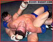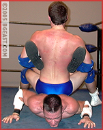 Every time Cole thinks he's got this college boy under control the kid comes back with something that knocks the heel stud from hell flat on his ass or ties him up in muscle knots. This college cutie just won't stay down! But Cole transforms one of the rookie's leglocks into a sweet submission of his own, surfboarding the boy's arms back to make him scream. Cole toys with his victim, cupping his hand over Alan's face, pretending not to hear his muffled cries of submission. Cassidy poses over the downed prettyboy, booting cruel pressure into the small of Alan's very sweaty, battered back. Alan attempts another daring comeback, bull-rushing the bruiser down and trapping him in a screaming full Boston crab earning himself a much deserved "I give." But victory is fleeting: Cole grabs Alan's hair, pounds his pecs, assaults his abs and stomps his back to several serious surrenders. Cassidy drags the boy to the corner post for a brutal back-breaking bow & arrow. Man, can that college boy scream! It's nitey night for Day! Nice and nasty!