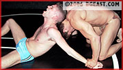 Shaking his head, Mr. Joshua lets Jeremy up and smacks him on the ass. "Get yourself together, boy!" he says, offering himself up in a referee's position. "Come on, kid, give me your best shot." Jeremy tries, only to be shrugged off. "This is a disaster, kid. Start over." And offers himself up again. This time, Jeremy ties the stud up in a headlock/body scissors combo, pouring on the pressure until he makes a typical rookie mistake! the veteran Mr. J strikes. He forces a submission out of Jeremy, but doesn't let up until the kid calls him "Mr. Joshua." Jeremy, though respectful, is no pushover, as Joshua soon finds out, slapping on another headscissors and starts snapping Joshua's bikini. Uh oh! Mr. J escapes and reverses. "THIS is how it's done!" Mr. Joshua is no longer in a friendly, let alone instructive mode, much to poor Jeremy's dismay. Wrestling class is over, and now it's time for the school of hard knocks. Mr. J puts the kid through the wringer of brutality and humiliation. Face sit pins, surfboards, backbreakers, scissors, bearhugs! Mr. J seems determined to end the kid's career! And the ending to this match may not be for the faint of heart but it sure as hell will leave you breathless! Woof!
