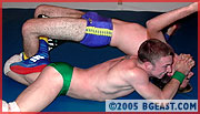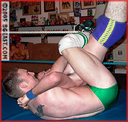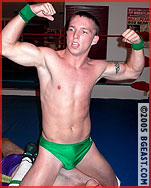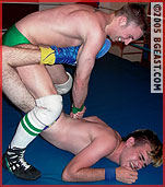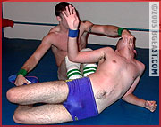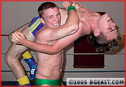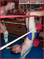 Beaten, battered, and bewildered, cute mohawk-mop topped Zach finds himself prone against the mat, while we are treated to one sexy showing of muscle posing from Jonny. But when Jonny becomes a little too ?self-absorbed,? Zach tries to retaliate, displaying Jonny?s V-shaped torso in a full nelson. Jonny seems more bemused than bothered as the hapless rookie fails to make an impression. A smart, quick reversal and Zach soon finds himself the student in Jonny?s ?school of VERY hard knocks.? Trapped in torture racks and trounced on the ropes, Zach?s seemingly-endless domination at Jonny's skillful hands harkens back to the early Kid Leopard. A devastatingly destructive over-the knee backbreaker sends Zach motionless and moaning to the mat, and positions him for a crotch-splitting suspended surfboard. A sexy, sleeperhold finishes off what is easily one of BG East?s finest rookie wreckings ever.