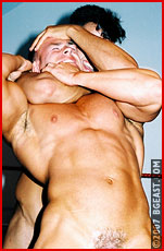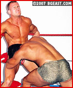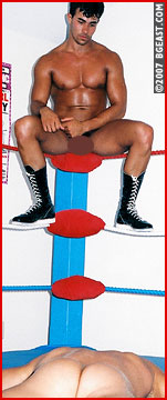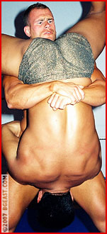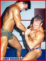 Our Marine hunk got battered by Cruze on HP1 and Max on HP2. He tries his luck here against a fellow rookie, the gorgeous Steve Sherman. Wade gets cocky, shows off his Mr. America physique and a pose-off ensues. Steve's blitzkrieg of blows drops the ultrahunk to the mat. Wade suffers magnificently, groaning in pain and arching his back in heavenly display before the circling heelhunk. Verbal abuse, a backbreaking submission, scissors, and super long bear hugs from each opponent lead to a pair of very large bulges as well as some groping strip wrestling. Steve continues his physical and verbal punishment on the nude Marine in this nude near-squash job. Pinned as only Steve can do it, Captain America faces the ultimate humiliation in this surprising and wonderful "battle of the butts."