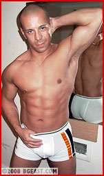 A Yank living abroad, Nate is a well-known and very accomplished wrestler British underground circuit. His win record would be the envy of any active mat man. Nate wasn't about to let some short musclebound French punk take the wind out of his sails in his BGEast debut! The two face off against each other in our London mat room, Nate just leaning against the wall and watching as Luc displays his muscles in pose after pose'all the while making contemptuous comparisons of their two bodies! Nate just shakes his head'he's taken apart much bigger guys than the skinhead Frenchmen! Fed up with the posing and posturing Nate drives a stiff punch into Luc's muscled abs sending the shorter stud crumbling to the mat. To accentuate the moment, Nate casually reaches down and strips Luc's white shorts off, leaving him clad only in tighty whitie boxers that cling to that delectable ass like a second skin' Oh yes, THIS is gonna be FUN!