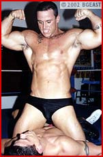 When Joe sees Ricky's pink bikini trunks, white boots and ring jacket he snickers "What the fuck! A pretty boy bitch." Ricky takes umbrage and challenges Joe to a posedown - and it's one of the sexiest you'll ever see. Joe pearl-harbors our latino lovely and pounds his huge forearms into Ricky's beautiful chest. And those pretty pecs which just moments before Ricky was showing off with great pride end up clamped in Joe's vise-like claw grip. Ricky's tight abs are the next target. When Ricky nelsons Joe, the tattooed tough is totally unimpressed, easily reverses it and spins the pretty boy airborne into submission and near-unconsciousness. The gorgeous jobber gets repeatedly stomped and slammed. Joe poses above him, taunting him to "cry, you little bitch!" An OTK back-breaker elicits another submission which Joe ignores. A single-shoulder back breaker has Ricky screaming again. But the beating is not over yet! A brutal rope-bound neck-breaking hangman leaves the beauty strung upside-down in the turnbuckle. A final huge body slam and one of the sexiest pins you've ever seen leads to some spectacular posing - and yet more punishment - including a massive bearhug. Another poor pretty job boy left a-quivering on the mat!