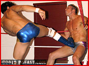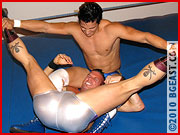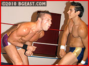 At one time, Donnie, too, was a naïve rookie just barely acquainted with the ropes. Now, of course, he is a savvy competitor who knows the game backwards and forwards. He knows that eight times out of ten the victory goes to the wrestler who gains a psychological edge over his opponent. Smirking, he stretches his abs and invites the model boy to take a free punch, overly confident, smug, and contemptuous. Rio surprises him with a hard right and then bounces him off the turnbuckle for a follow-up punch planted squarely on Donnie's midsection. Drake groans and crumples to the mat, and Rio locks him between his thighs and squeezes a submission out of him in less than a minute.