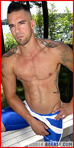 So imagine Jake's delight when he finds big, beautiful stud Carter Alexander stretching in the gazebo before their match. Carter is incredibly lean, with shoulders a mile wide and a stunningly sexy, incredibly carved torso. New to BG East, Carter competed in high school wrestling but had nowhere near the success Jake enjoyed. He wears a tight blue singlet with the straps pulled down around his waist, showing off his rock hard abs and thick, pumped pecs. His long, hairy legs, buzz cut, and bold tattoos all say just one thing to Jake. It's time to reel in another rookie who has no idea what's about to hit him.