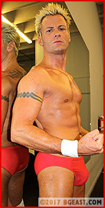 Two of the mouthiest wrestlers in the business, they launch a barrage of insults back and forth the instant they lay eyes on each other. "Oh, I'll earn your respect," Jobe snarls when Kid Karisma cockily turns his magnificently muscled backside toward him dismissively. "I'll earn your respect with your face right here, introducing you to the Centerpiece." He points at his pendulous crotch swinging and bouncing expectantly in his overstuffed, skimpy red trunks. Kid K has been known to cut a bitch with just a glance.