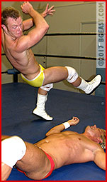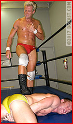 It's most definitely personal when Kid Karisma starts punching Jobe's vaunted bulge like a speed bag. "Hey Mr. Centerpiece, take a look at this!" Kid Karisma snarls furiously, grabbing his own ample bulge and shaking it in Jobe's face. A soaring flying drop kick slams Jobe to the mat, leaving Kid Karisma licking his lips as he circles his injured prey.