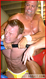 And Kid Karisma suffers quite unlike we've ever seen him before, his award winning ass spanked and his nose shoved into Jobe's smothering face-to-crotch headscissors. Both battlers scream in terror, but just one adrenaline hyped stud finally drags the loser out of the ring to assume his rightful position as the winner's fetch-and-carry boy.