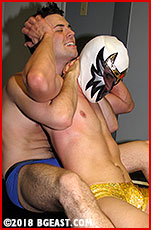 The next twist gives the contest its symmetry, aka payback! Drake gets Gold Shaft in a rear naked choke and knocks him out. Here is an opportunity to pull the mask off and reveal his opponent's identity. Instead, Drake caresses the body much as Shaft had caressed his. At this point, one of two things is likely to be true. One is that Gold Shaft and Marcos are engaged in a make-believe game of You Do Me Then I'll Do You. The other is that, through an odds-defying coincidence, Gold Shaft violates the one man whose fantasies are as dark as his own. In the world of BG East, one is as likely as the other. When Shaft awakens, Drake restrains him in a full nelson. Shaft thrusts his hips forward and then slams ass back to Drake's crotch repeatedly, at last escaping and putting Drake into a side headlock.