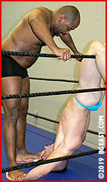 Cole is quick to fire back. He low blows Maxx and catches him in a tight hold. When pressed, Cole is notorious for his savagery, raking his fingers across opponents' eyes, punching with closed fists. "You're a big one, but I think I can break you in half!" he boasts and proceeds to prove his point. Cole is a master strategist and fight technician, but Maxx is a heavyweight nearly twice Cole's size. Danno busts loose, and the action turns barbaric as the wrestlers hurl each other across the mat and torpedo each other with their bodies. After submitting Cole a second time, Maxx squats on his chest and dribbles a 25-pound medicine ball on Cassidy's highly celebrated abs!