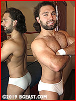 Zack Reno is a good-looking guy with a great body, some sensually placed body hair, a nice beard, and a full head of gorgeous thick brown tresses. In fact, he's working on his hair in the ring, but just can't quite get that do shaped right. It's not quite perfect -- and when you're as pretty as Zack, you really have to maintain a high standard!