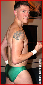 Check out Dante Lesen for size. In the ring, Kirk Donahue is halfway through a wisecrack when Dante steps up on the apron. Surprise, surprise. The new hire seems a foot taller with an ear-to-ear smile that's both gleeful and daunting. "Okay. All right," Kirk says with a hint of whimper in his voice and backs up a few inches. Classic Kirk. Dante steps over the top rope. He doesn't bother to leap. The two men circle each other. Quickly over the initial shock, Kirk quips, "Looks like you're here ready to wrestle. Is that what we gonna do today?" Dante replies, "Let's see." They lockup with force. Keep in mind, a firm lockup is one of the manliest gestures in professional wrestling. It signals both fair play and pugnacity. This ship is ready to sail.