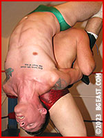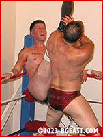 For the next nine minutes, Kirk throws everything he's got at the newbie. And that's a lot, and every savage assault is perfection, with Kirk barely breaking a sweat. Then, he charges in on Dante, who's hanging off the corner ropes. Dante thrusts his whole body up in the air, and Kirk slams his shoulder against the hard ring post. Still throbbing with pain, Kirk backs up into Dante's brawny arms. Kirk howls while Dante crushes his ribs. But Dante's hope spot turns into a mere speck when Kirk mule-kicks his crotch. Maybe Kirk was just playing possum earlier. Scholars will be debating that point for decades. All we know is that Dante Leson is about to endure a hell of a whupping.