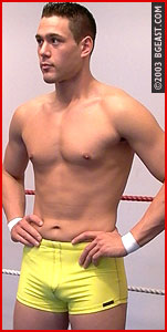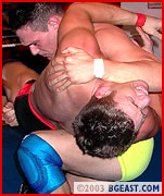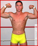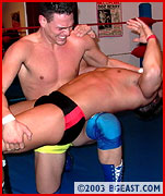 Primetime has been dreaming of making it big as a wrestler since he was a kid. Blond, beautiful and blessed with a body ideally suited for wrestling, we admit we might have given him just about anything to get him in our ring. But he had only one demand: a debut match against Nick Archer. Primetime was overweight when we first interviewed him but with the promise of a first pro match with Nick Archer he disciplined himself to a program of wrestling-readiness. Barely drinking age himself, clad in black leather and dripping attitude, Nick doesn't relish the thought of playing the vet to a prettyboy upstart. "You won't be so pretty when I finish with you," Nick promises as he sheds his jacket, revealing his intimidatingly bigger 'n better-than-ever body. No hollow threat--Nick quickly overpowers the rookie, grinding his head between his big biceps and bulging pec with a tight headlock. But when overconfident Nick wastes time bragging, Primetime catches him off guard with a big fist to the gut, before debuting his brutal spinning backbreaker--once, twice, three times! Can this be happening? Never count Nick out--he feeds off pain. Victory is total, but the winner returns post-victory to brutalize the loser again (and again!).