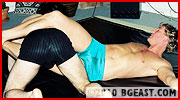 Kyle's sultry tough guy style is just what horny Chip loves. Both trunks show substantial packages, but they're not clad for long! Great crotch viewing with bridging headscissors and many legsplits! Lots of crotch grabbing, ass-slapping action. Faces get pinned with dicks, and dicks get "punished" by lips and tongues! An amazing 69 double cocklock! Chip's cock'n'balls get pressed by Kyle's bare foot. Raunchy Chip services the sultry stud and explodes in submission, then Kyle humps his face. Kyle gets turned on by Chip's counterattack, and soon they both explode, Chip shooting his big gun for a second time!! Sizzling apartment action, maximum variety, sexy finishes, a hot X-fight! - for only $49!